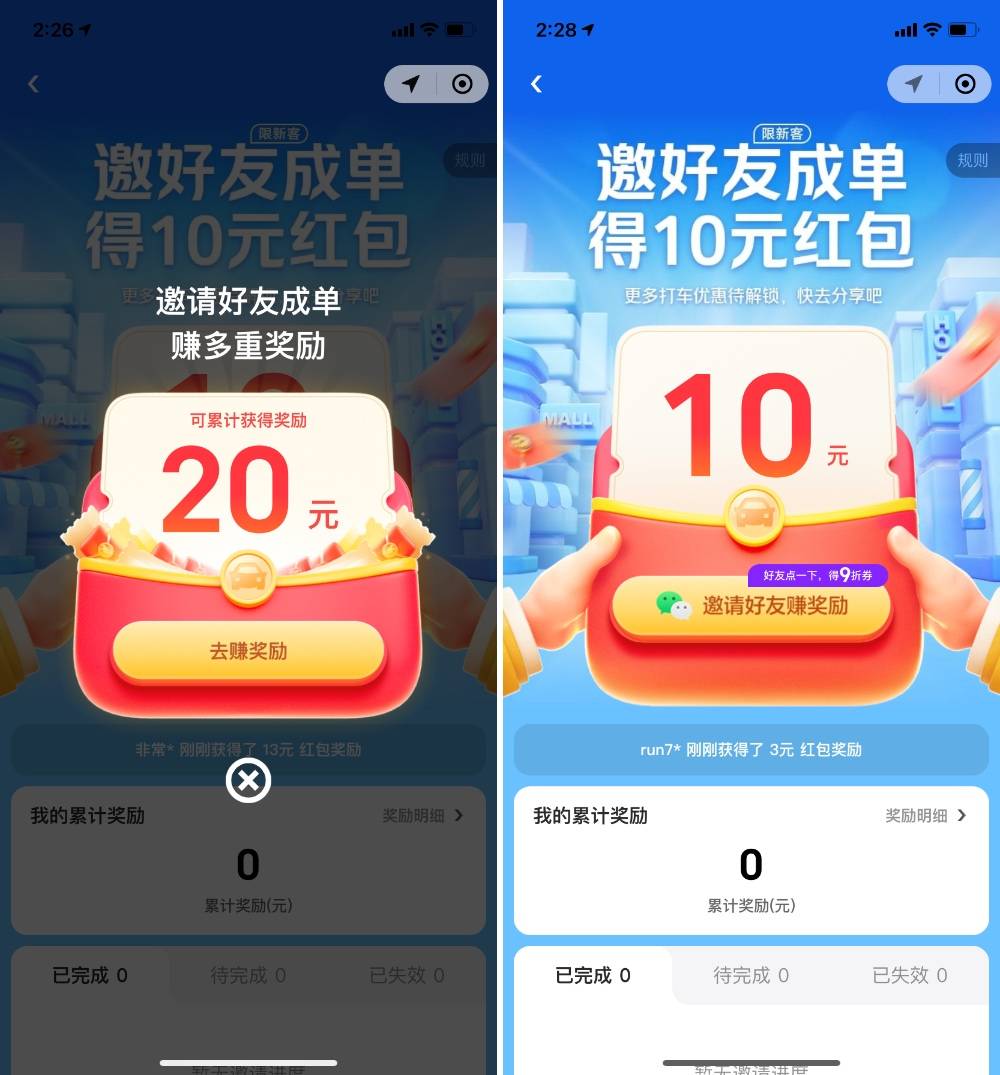 一周过去了,美团打车已经有了邀请有礼机制,邀请好友成单可以获得 20 元的奖励。新客好友成单可以得到 10 元的红包,好友点击则能赚取 9 折券的奖励,在美团打车运力充足的区域,这套体系应该已经在微信揽新客了。
