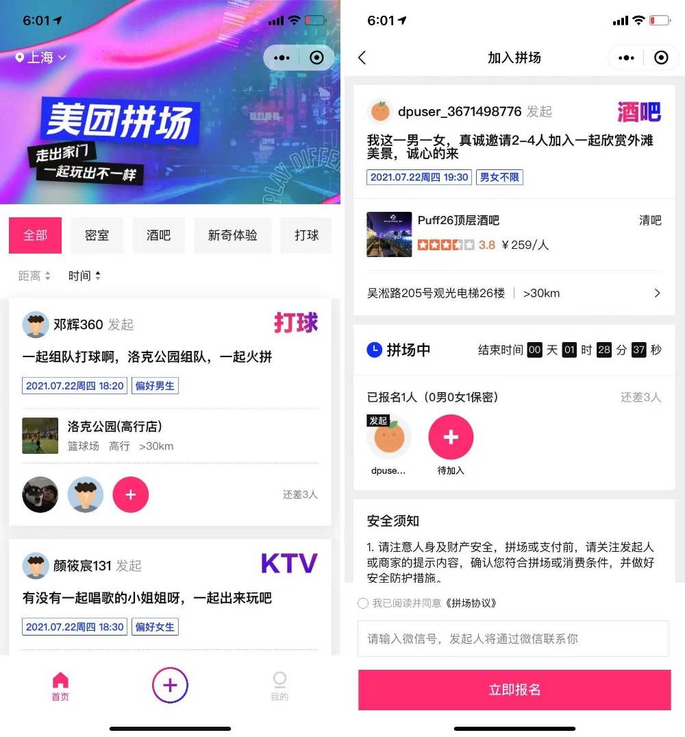 和美团打车属于集团大战略不同,「美团拼场」就是一个自身服务延伸的小工具。它可以帮助想要出门玩的年轻人完成拼场,密室、酒吧、新奇体验、打球都能在这拼场报名,目前仅在上海和成都开通服务。