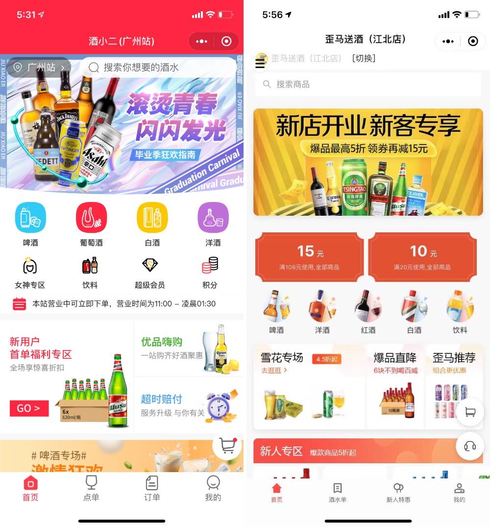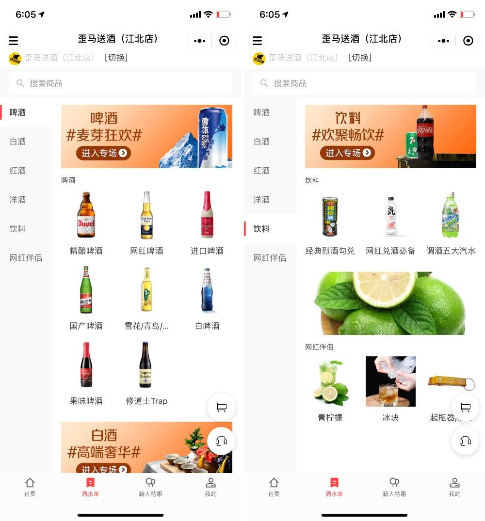 目前「歪马送酒」的小程序有一个新客专享的活动,给了新人诸多优惠。售卖的酒品有啤酒、白酒、红酒、洋酒,还搭配了一些和烈酒勾兑、网红兑酒必备的饮料,即便是冰块、青柠檬也是和酒饮有极高关联度的产品。
